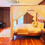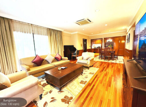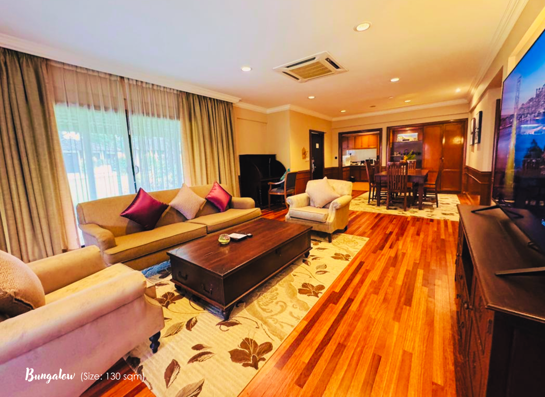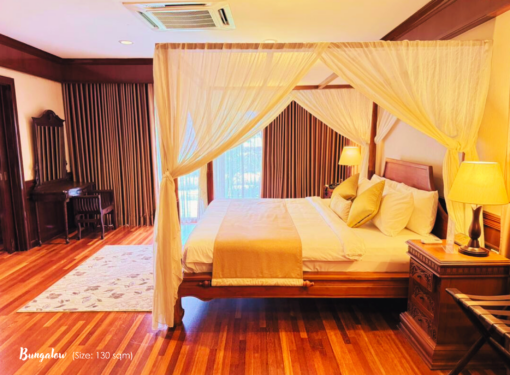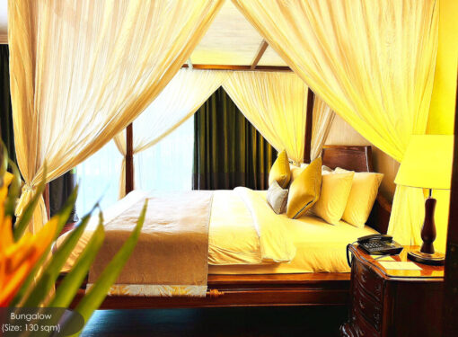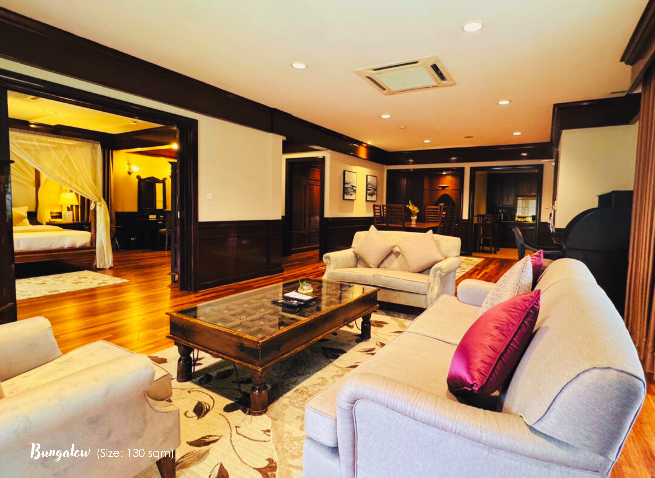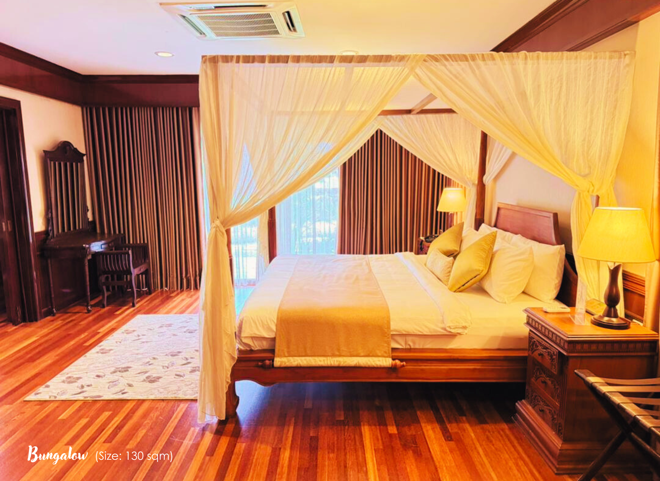 Experience the comfort of our spacious bungalow chalet, designed to accommodate families in style. This fully air-conditioned retreat features two inviting bedrooms, including a luxurious king-size bed, and a private lounge area that opens up to breathtaking views of the enchanting gardens.